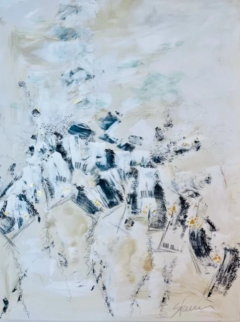 L'œuvre est une composition abstraite dominée par une palette de blancs, de crèmes, de gris et de noirs, créant une profondeur et un contraste saisissants. Cette gamme de couleurs limitée et classique évoque l'élégance intemporelle des touches d'un grand piano ou la beauté austère d'une partition musicale. Des formes angulaires et semblables à des blocs, en particulier des segments noirs et blancs, rappellent des touches de piano ou des notes musicales abstraites dispersées sur une partition. La présence discrète mais marquante de paillettes dorées apporte une touche de chaleur. Les éclats dorés ne sont pas de simples ornements ; ils agissent comme des "points forts" ou des "accents" visuels, comparables à une note soutenue et résonnante, ils introduisent des moments de brillance inattendue au sein de la composition. Des lignes fluides et calligraphiques parcourent la composition, suggérant le mouvement, le rythme ou même une écriture illisible.L'ambiance générale est contemplative, dynamique et élégante, évoquant peut-être une puissance tranquille ou un crescendo en construction.